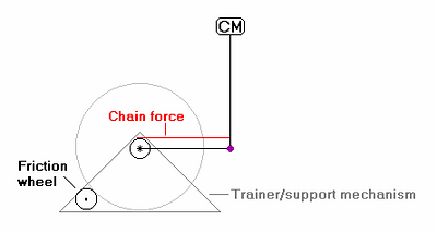 After these calculations, it should be easy for anyone to verify that PCL is not correct, even for a rider pedaling a bike while floating in free space [again remember our pole and wheel experiment from Figure 2.5), with the earth as a very large front triangle]. In this case, an almost parallel chain line is appropriate.