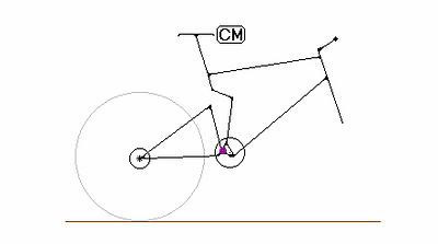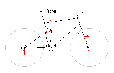 Figure 2.9) shows the front and rear triangles of a “coasting” mono-pivot, with the various forces acting on them, minus friction in the hubs and air, which we neglect (the forces are not drawn to scale). “CM” indicates the rough position for the rider/main triangle center of mass.