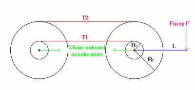 Figure 2.11) shows a drive train with two possibilities for a 1-1 gearing. L is the crank lever, R1 and R2 are the respective cog radii, and T1 and T2 are the chain tensions for each case.