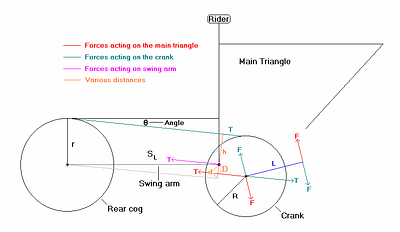 So we see that, neglecting the mass of the crank, the torque on the main triangle from pedaling is just as if we had been pulling on the chain from a point on the main triangle that is a perpendicular distance h above the pivot – a very interesting result (see Ola Helenius for an interesting intuitive argument for this result, though we are not exactly sure where it is on his site). However, one must be very careful not to take this result too far; as we have seen, for a given pedal force, the larger the radius of the front cog, the lower will be the chain tension.
