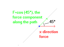 Suppose you have an x,y-axis. A particle, such as a marble, is restricted via some mechanism to move freely along the diagonal in the first quadrant. Any number of mechanisms could achieve the restricted movement. Now suppose there was a force F pushing on the particle in the x-direction. The equations of motion for the particle would involve F*cos (45°), that is, the direction of motion, but not the mechanism that restricts the degrees of freedom. Figure 3.3) shows the path, force, and force component along the path.