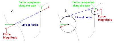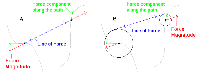 Two particles move along paths relative to one another. If a force is induced between them, it will cause both particles to accelerate along their respective paths in the direction corresponding to the tangent component of the force along the path. Figure 3.4 A) shows this scenario.