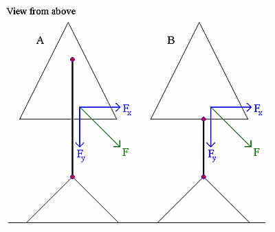 Figures 3.6 A) and B) depict main triangles attached at different points to swing arms of different length. The paths that these swingarms produce are of different radii, but have the same path tangents at the initial locations of the base/swingarm pivots. We depict the mechanisms as being horizontal and viewed from above, so that we may start at equilibrium before a force F is applied to the main triangle. Without loss of generality, we choose the swing arms to be aligned along the y-axis.