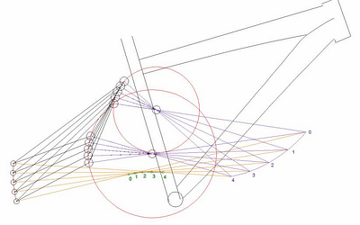 There is a fairly well defined virtual pivot located well above and behind the bottom bracket. The height is similar to that of the NRS, but farther forward. This will give the bike characteristics similar to that of a very high pivot mono-pivot; though the virtual pivot is located a bit farther back then could be the case on a standard mono-pivot. One should find quite a bit of both anti-squat and kickback with this frame, though the tradeoff will be a tad less then in conventional mono-pivots. Shock absorption should be good, in spite of the relatively tight wheel path curvature, due to the high virtual pivot and rearward sloping wheel path through travel.