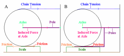 Figure 5.2 A) shows our pole and wheel turned sideways, with the wheel resting on a scale. The scale will read the force between the wheel and the ground. Horizontal tension in the chain will not alter the scale reading. More to the point, friction exerted on the wheel (red), will also have no impact on scale reading, since it is directed horizontally. The same is true for friction acting on the scale (orange). There could be locking friction or no friction, and the scale reading would be the same because there are no vertical components of force involved.