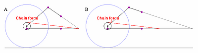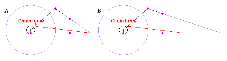 Now, suppose on both of the above suspensions, we imagine: increasing the rear wheel radius; correspondingly decreasing the rear cog radius; and keeping everything else the same. This produces the configurations in Figures 5.6 A and B). ICT does not ascribe any significance to the location of the rear axle, so supposedly nothing has changed in either case.