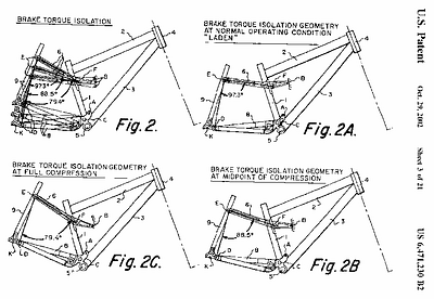 Ellsworth's recipe for a 4-bar suspension, to supposedly achieve their claims for performance under braking, is explained below in quotes from U.S. patent 6,471,230. Figure 5.7) shows “FIG. 2”, etc. of U.S. patent 6,471,230, which is the diagram for the explanations to follow.