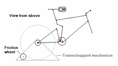 Recall that all of the forces on a coasting bike sum to zero. Bicycle acceleration acts on the frame members through the rear axle. So we eliminate the torques generated due to bike acceleration under pedaling by clamping the bike at the rear axle, in a friction wheel equipped trainer. We can dispense with the fork term by turning the bike sideways and imagining some alternative force to gravity keeping the rider attached to the seat. Figure A1) diagrams this: