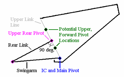 Figure 3.13), depicts a 4-bar suspension frame with various possible locations for the upper, forward pivot, giving an IC at the main pivot. Path Analysis tells us that this frame will rear-brake identically to a mono-pivot with identical main pivot location, at the depicted point in travel, because the path tangents of the rear brakes will be the same in both mechanisms.