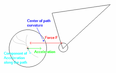 Now consider a particle such as a wheel axle that is restricted to travel along a particular path relative to other components in a mechanism (a main triangle for example). If forces are exerted by the other components on this axle, by whatever means, the axle will tend to move in the direction along its path that corresponds to the tangent component of the sum of the forces. The magnitude of the tangent component determines the motion of the axle. Similar considerations exist for the other components.