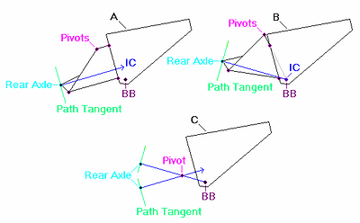 First, mono-pivot paths will always be circular about the main pivot. 4-bars can have varying path curvature. The easiest way to see this is to consider Figure 3.10 A). Draw the complete circular path of the upper rear pivot as the upper link rotates about the upper front pivot. Next, consider the path of the lower rear pivot, as the upper rear pivot goes through its revolutions. This lower pivot will move back and forth along a circular arc. By “‘Nature Varies Smoothly' (NVS).”, we see that the paths of points along the rear link will be much like the upper link circle for points close to the upper link, and much like the lower link arc for points close to the lower link. The paths will gradually change from one to the other as the points vary along the rear link. An axle mounted somewhere in between will have varying path curvature.