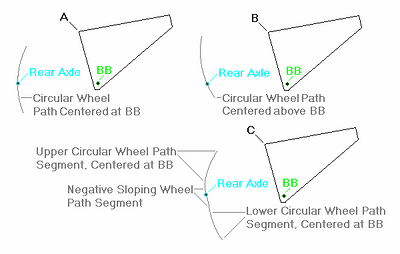 Any comment on frame performance must be made with respect to a range of forks, just as is the case with rider mass. So an assumption must be made for fork characteristics. In addition, dual suspension bottom brackets (BBs) are almost universally 13" ± .5" from the ground without rider, given a typical assumption for the fork “Crown to Axle Length” or “CAL”. Thus, the rear wheel and BB largely determine the frame orientation to the ground. So, after noting the required fork assumption, we can neglect the front wheel without much problem. [If one is uncomfortable with this, then one may certainly consider the front wheel axle path. This and the rear axle path will determine orientation of the main triangle to the ground (again, a CAL assumption must be made)].