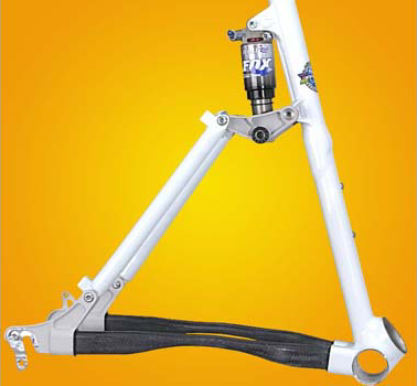 Figure 4.8) shows a picture of the rear suspension, taken from Cannondale's web site (with permission). The thin, flexible section of the chain stays is meant to act like a pivot. The path tangent starts out at nearly vertical and curves forward. The chain stay length is initially increasing, since the BB is centered below the height of the rear axle. We have not bothered to plot the path, since the center of curvature is going to be at the thin part of the stays. The intended benefits, as explained on the Cannondale web site, are an increasing effective chain stay at sag, with a tight curvature to reduce bump feedback.