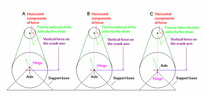 In both cases, the vertical impulse at the pedal is felt at the crank axle as a vertical force. This, in turn is balanced by other vertical forces from the ground and the vertical components of the forces induced in the chain and wheel. That is, all of the vertical components of forces cancel. This should be pretty obvious, since we assume that the force of the pedal stroke does not dislodge the pole from the hinge or crush the pole. Now we must look at the non-vertical components.