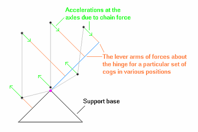 We can see that even the same set of cogs will provide various results in various positions by moving a particular set around relative to the hinge and to each other. Figure 5.9) shows the forces on the pole for a particular set of cogs in a number of positions. Note the differences in the forces and lever arms in each of the cases, which make the torque about the hinge different.