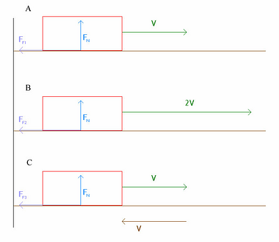 Addition of velocities is linear in classical mechanics. We may thus switch reference frames and it is immediate that the situation in Figure 5.1 C), were the block slides with velocity V and the surface is now in motion with velocity -V, will produce frictional force FF3 = FF1 = FF2. It is also immediate that the acceleration of the block in all cases will be a1 = a2 = a3 = FF1/m, where m equals the mass of the block.