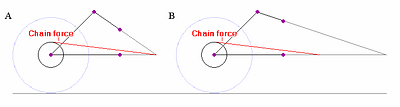 Now, suppose on both of the above suspensions, we imagine: increasing the rear wheel radius; correspondingly decreasing the rear cog radius; and keeping everything else the same. This produces the configurations in Figures 5.6 A and B). ICT does not ascribe any significance to the location of the rear axle, so supposedly nothing has changed in either case.