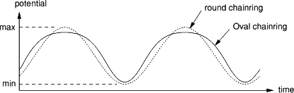 To compare round and oval, we use a strongly simplified (not manufacturable) oval cahin wheel. The chainwheel has the same number of teeth as the round one and an ovality of 1.5 . Also the chainwheel is block-shaped. The half of the chainwheel has a small diameter equal to 4/5 of the round chainwheel. The other half has a large diameter equal to 6/5 of the round chainwheel. The chainwheel is mounted so that the large diameter exactly matches the phase of great power from the leg muscles.